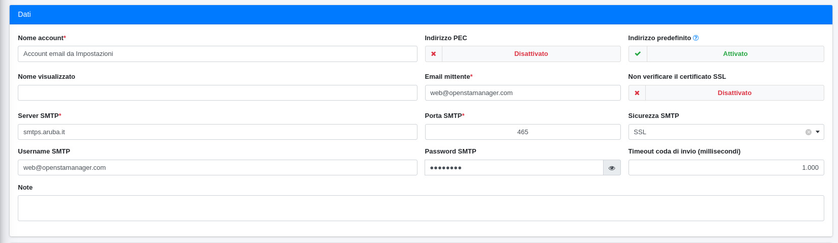 In particolare, vengono resi disponibili i seguenti campi relativi alla gestione di account SMTP: