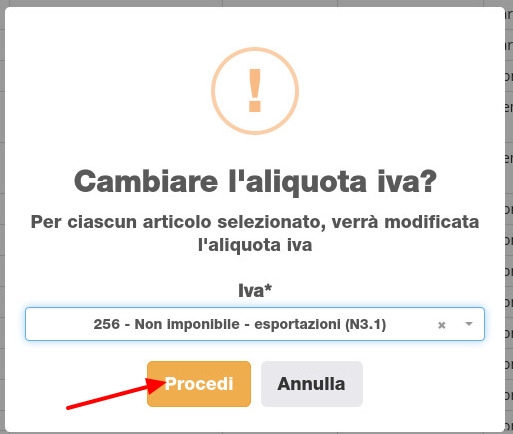 Il gestionale chiederà ora l'aliquota IVA da applicare agli articoli selezionati.