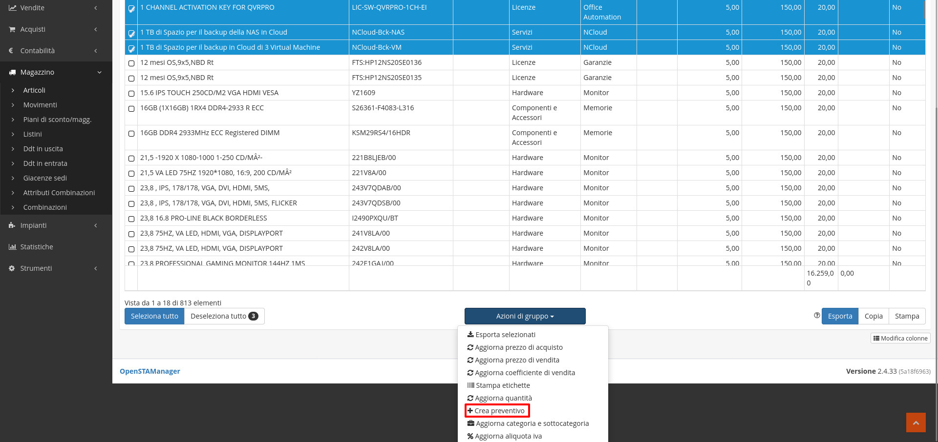 Una volta selezionati i record interessati è possibile creare un preventivo cliccando su Azioni di gruppo/Crea preventivo.