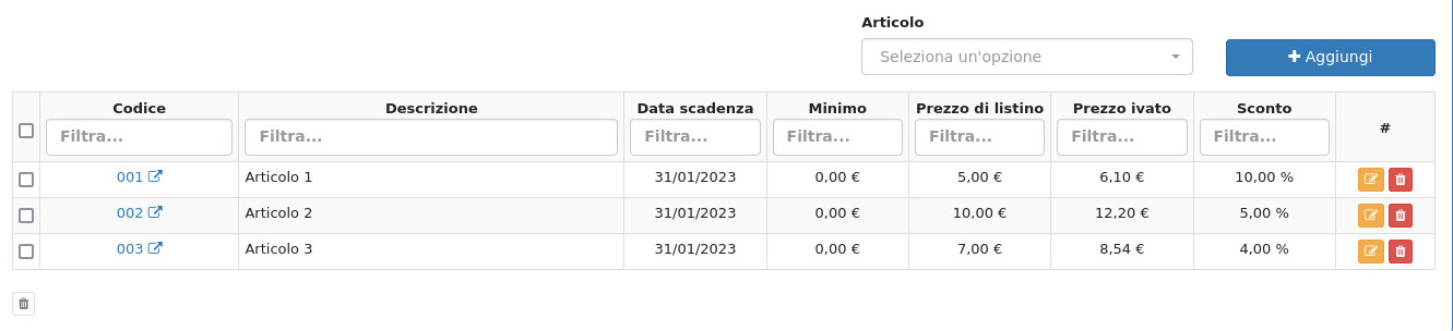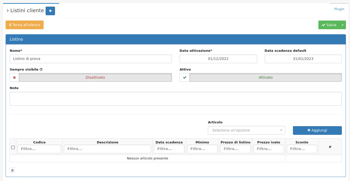 Dalla schermata di dettaglio del listino sarà ora possibile andare ad aggiungere degli articoli, impostandone il prezzo e lo sconto: