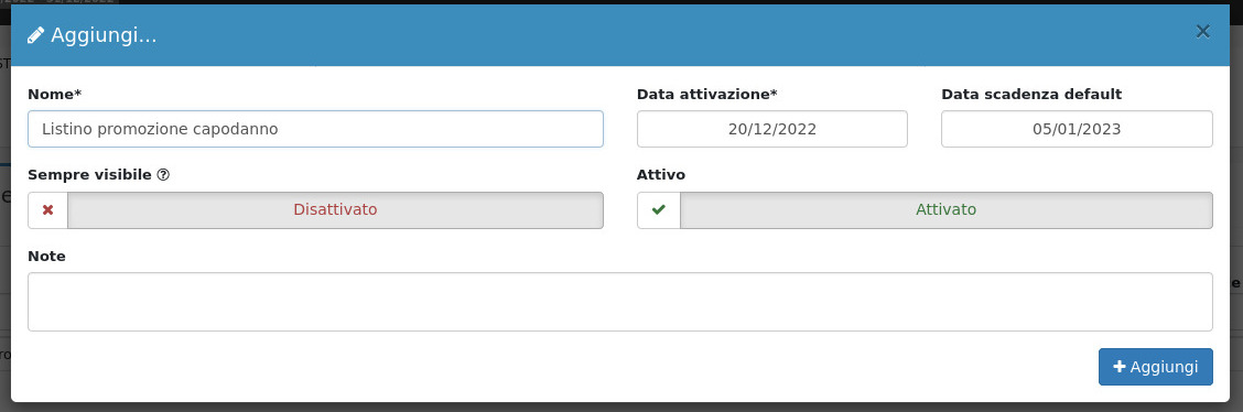 Dalla sezione generale è possibile visualizzare il numero di listini attivi e di quelli scaduti, per creare un listino sarà sufficiente cliccare sul tasto (+).