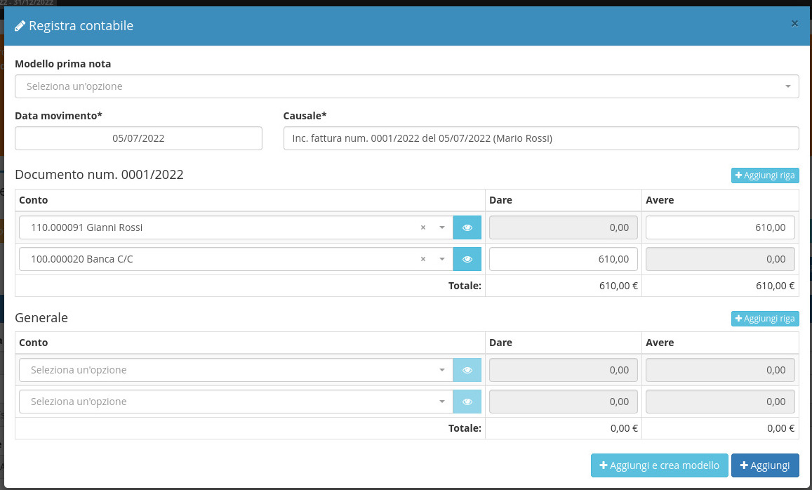 In Contabilità/Prima nota sarà ora possibile trovare le scritture contabili appena registrate.