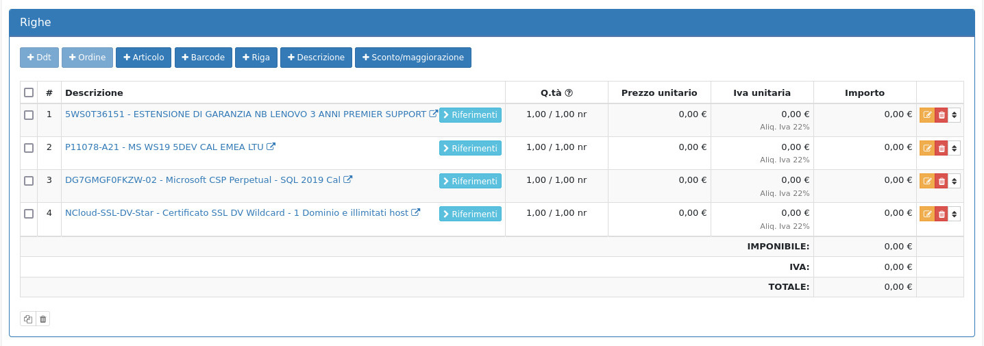 Da qui si dovranno ora specificare la sede di partenza e di arrivo della merce, e inserire come righe gli articoli da spostare.