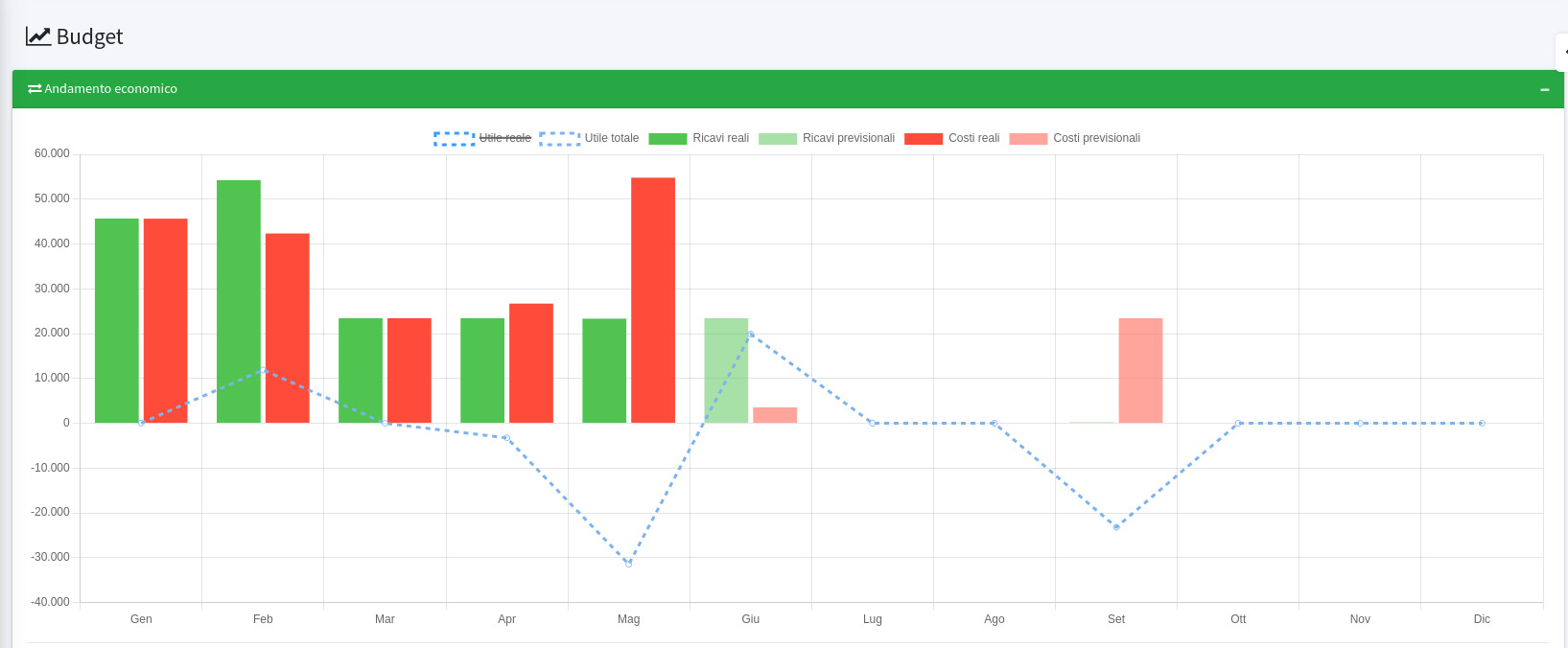 A seguito dell'installazione del modulo, cliccando su Budget apparirà il seguente prospetto che evidenzia l'Utile totale, dato dalla differenza tra ricavi e costi totali.