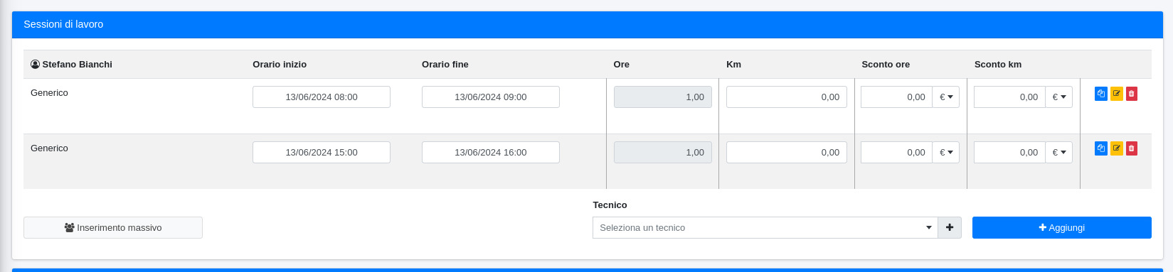 Con la funzione Inserimento massivo è possibile pianificare massivamente il lavoro dei tecnici creando più sessioni contemporaneamente per uno o più tecnici.