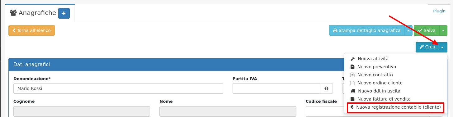 Si dovrà ora accedere al modulo Anagrafiche, entrare nella schermata di dettaglio del cliente interessato e cliccare su Crea.../Nuova registrazione contabile (cliente).