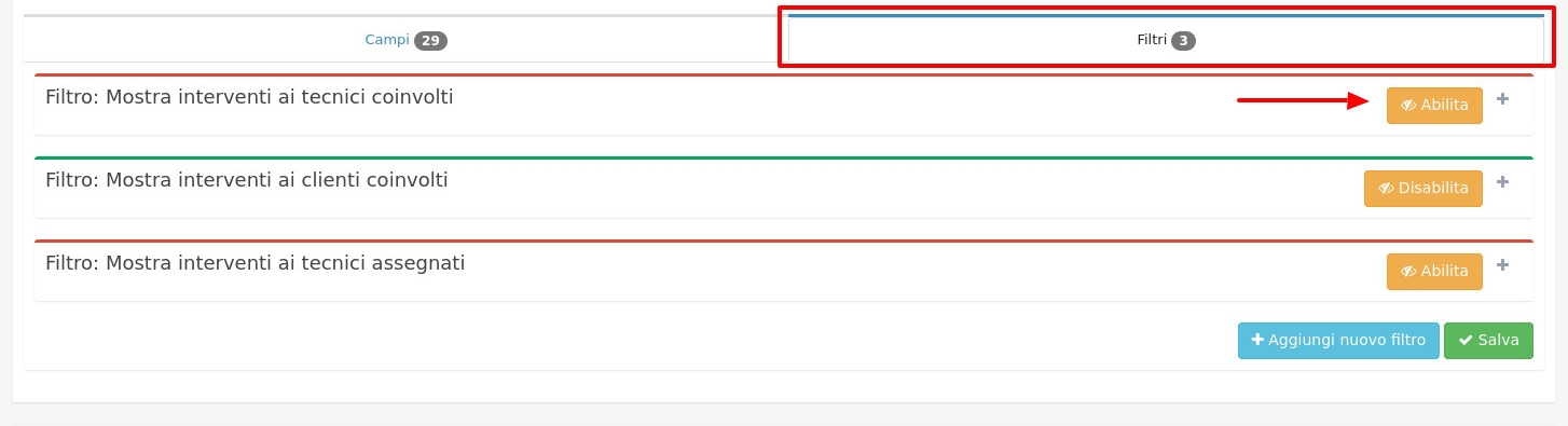 Per permettere ai tecnici di visualizzare tutte le attività si dovrà quindi andare a disabilitare il filtro "Mostra interventi ai tecnici coinvolti".