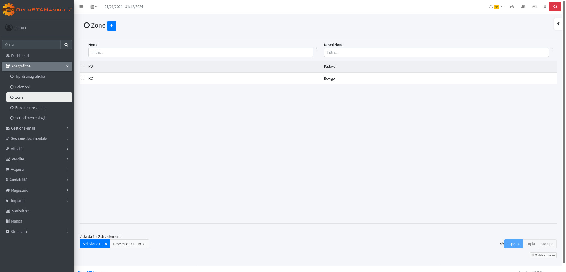 Questo modulo è dedicato alla gestione delle eventuali suddivisioni, da parte dell'azienda, del territorio in aree. Grazie ad esso, è possibile assegnare specifiche anagrafiche ad una zona di servizio per tecnici specifici e gestire in modo dinamico le attività visualizzate nella **Dashboard**.