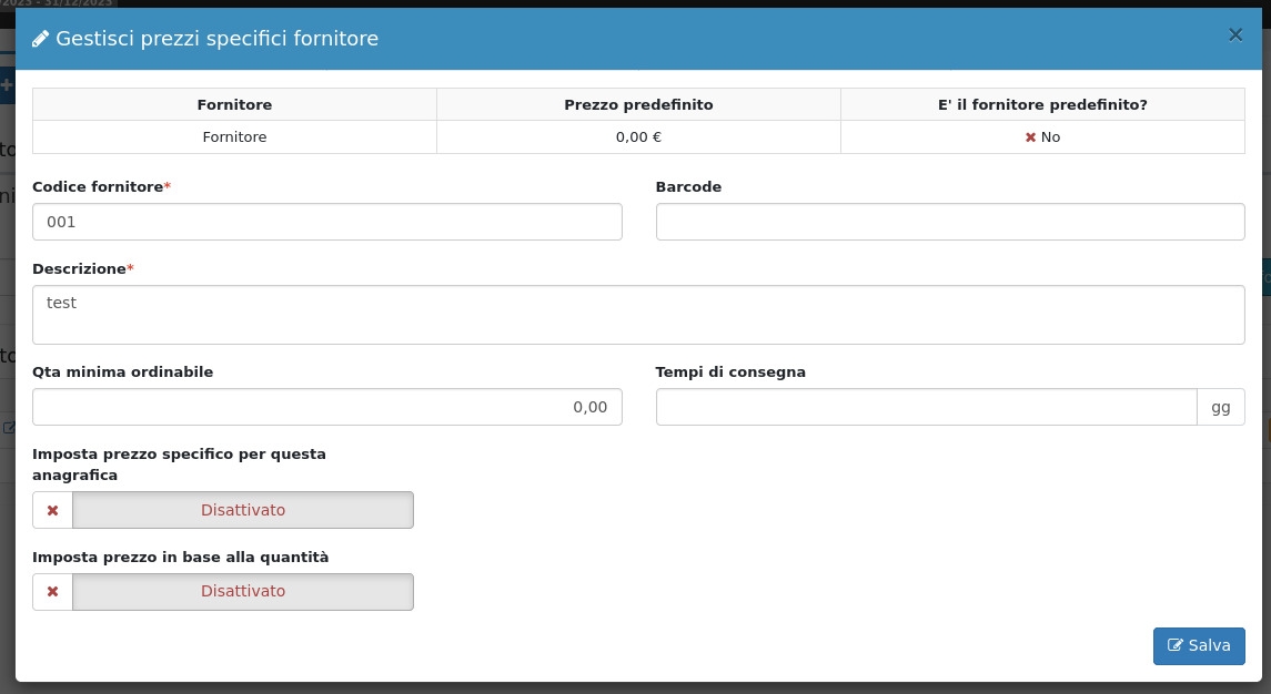 Per poter impostare un fornitore come fornitore predefinito dalla scheda articolo, è necessario abilitare la spunta Imposta prezzo specifico per questa anagrafica, inserire un prezzo specifico e salvare.
