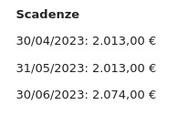 Selezionando questa modalità di pagamento in una fattura di vendita con data 10/02/2023 verranno quindi generate tre scadenze: