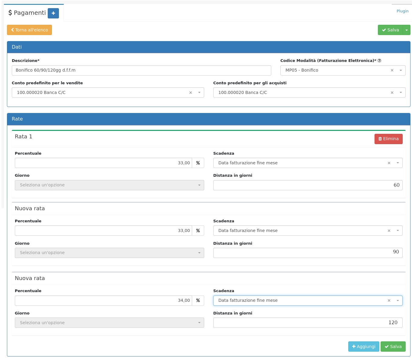 Volendo aggiungere alle modalità di pagamento il Bonifico 60/90/120gg d.f.f.m si dovrà aggiungere un nuovo tipo di pagamento che riporterà 3 rate da 33%, 33% e 34% dell'importo complessivo, rispettivamente a 60, 90 e 120 giorni dalla data di emissione della fattura (da specificare nel campo Distanza in giorni).