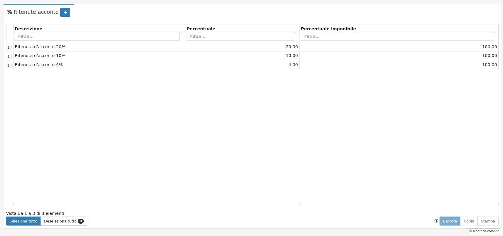 Per creare una nuova ritenuta d'acconto si dovrà cliccare sul tasto (+).