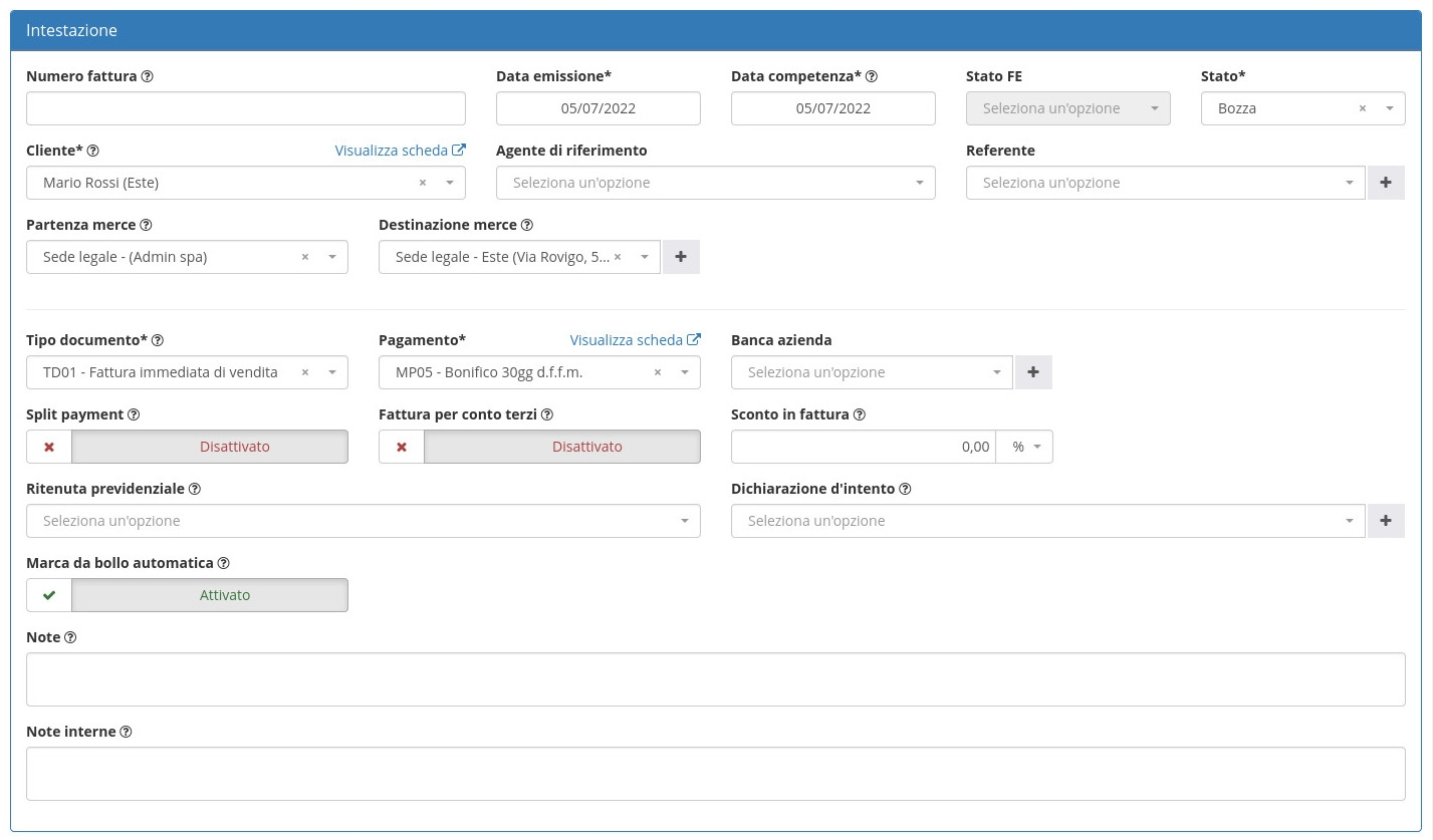 Andranno qui inserite le informazioni relative alla nuova fattura di vendita: