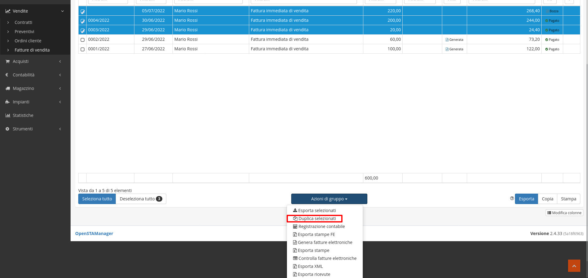 Guida alle azioni aggiuntive del modulo Fatture di vendita in OpenSTAManager
