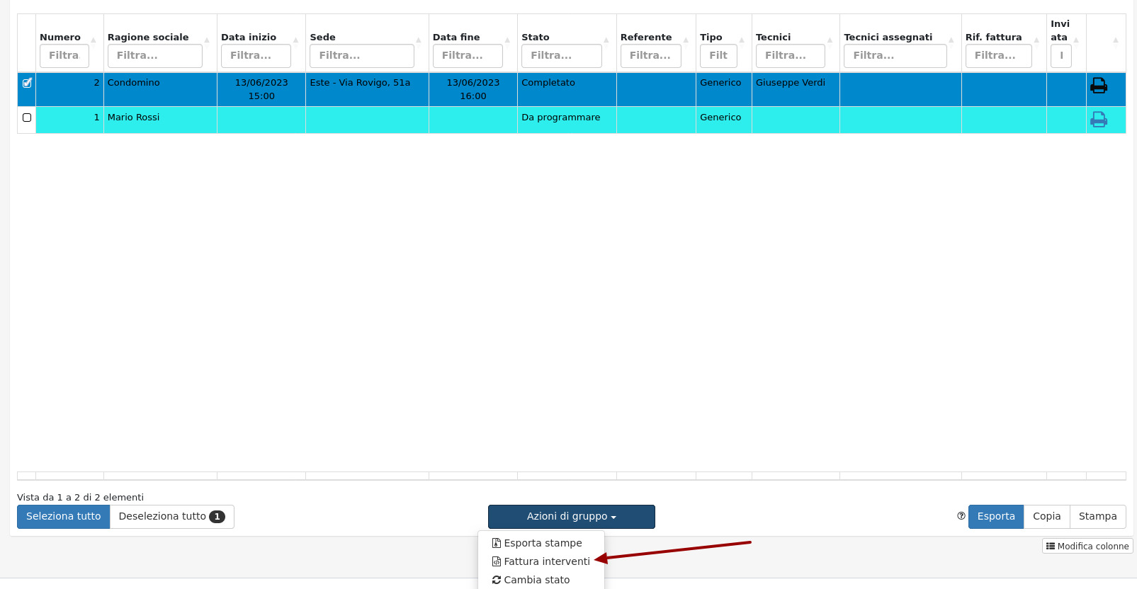 Andando ora a selezionare le attività interessate sarà possibile procedere alla loro fatturazione tramite azioni di gruppo cliccando su Fattura interventi.