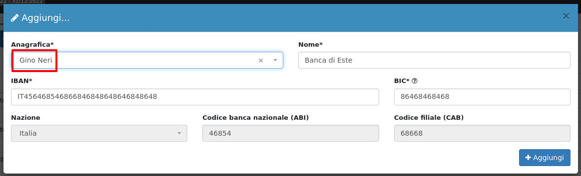 In anagrafica dovrà essere selezionata l'anagrafica a cui la banca andrà quindi collegata.