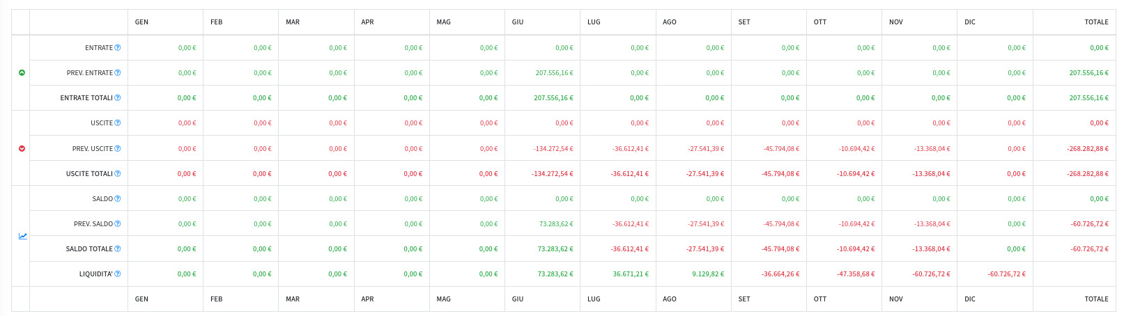 Mentre la previsione di ricavo o di costo dell'andamento economico avviene per intero e in base ad una specifica data del documento, la previsione di entrata/uscita dell'andamento finanziario considera l'importo lordo e lo distribuisce in base al tipo di pagamento specificato nel documento o, se mancante, legato all'anagrafica a cui è collegato il documento.