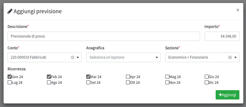 Le previsioni economiche sono configurabili dal sotto-menu "Previsionale", da cui è possibile creare delle previsioni di costi e ricavi, con la possibilità di selezionare la ricorrenza.