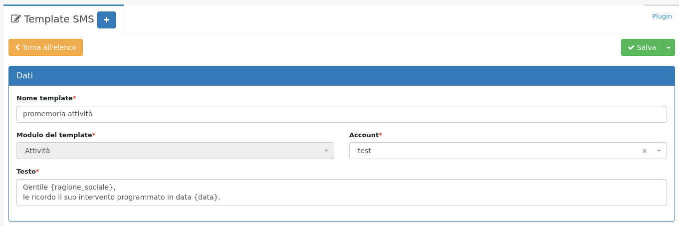 In questo modulo è possibile creare nuovi template per l'invio di SMS