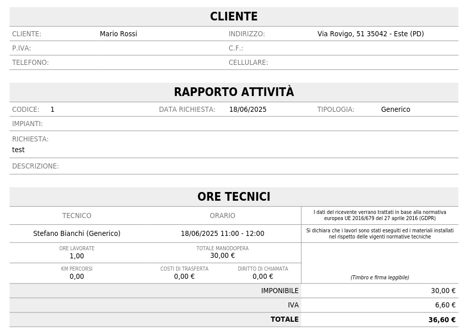 Dalla schermata di dettaglio di un'attività è possibile procedere alla visualizzazione della sua anteprima da far firmare al cliente per segnalare l'avvenuto completamente.