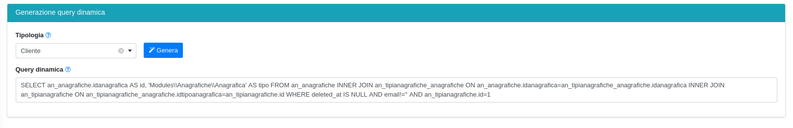 Selezionando una tipologia di anagrafica nel campo Tipologia e cliccando su Genera, è possibile generare la relativa query dinamica, che estrae le anagrafiche appartenenti a quella determinata tipologia.