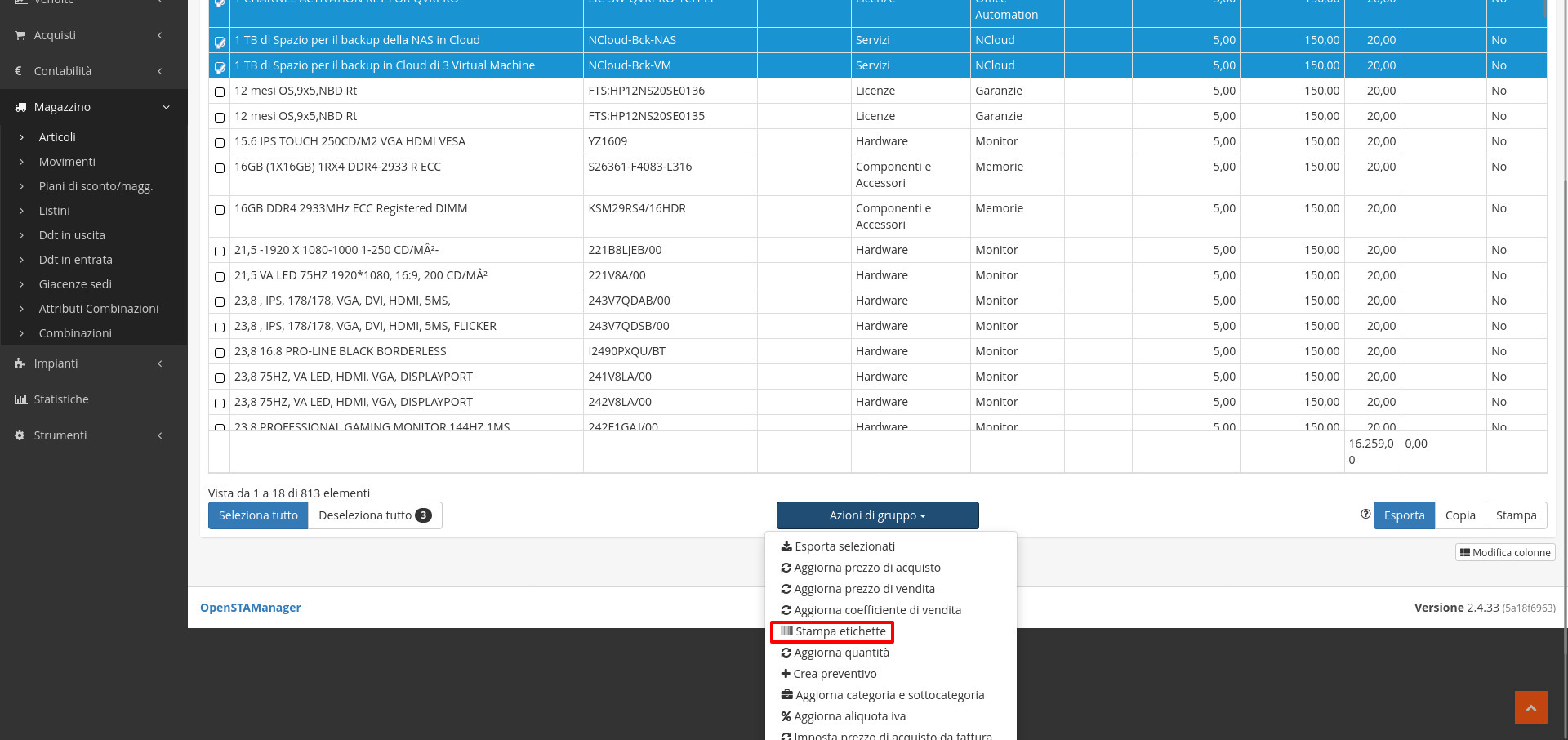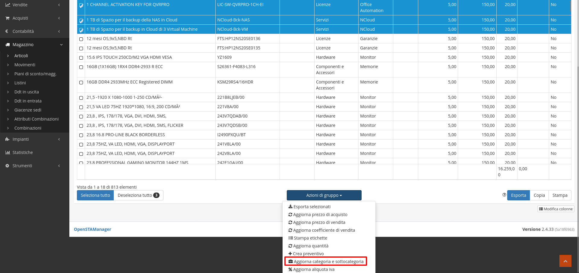 Il modulo Articoli permette di svolgere diverse azioni massivamente dalle azioni di gruppo: