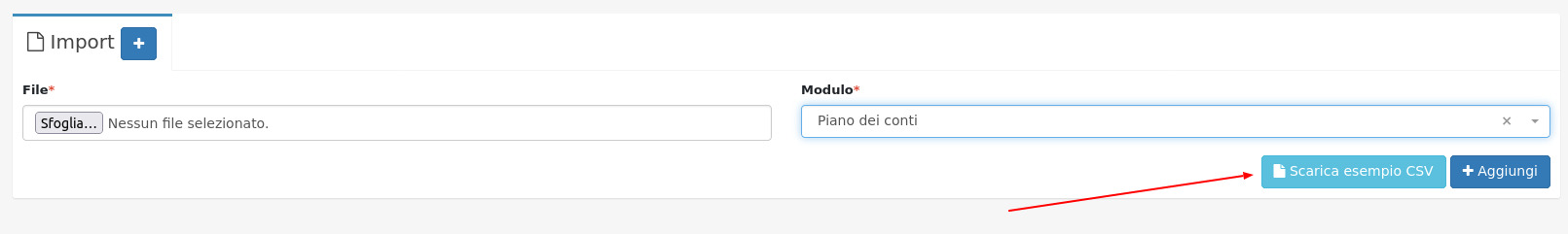 Cliccando su questo pulsante si aprirà un file di esempio di come importare il piano dei conti tramite il file CSV.