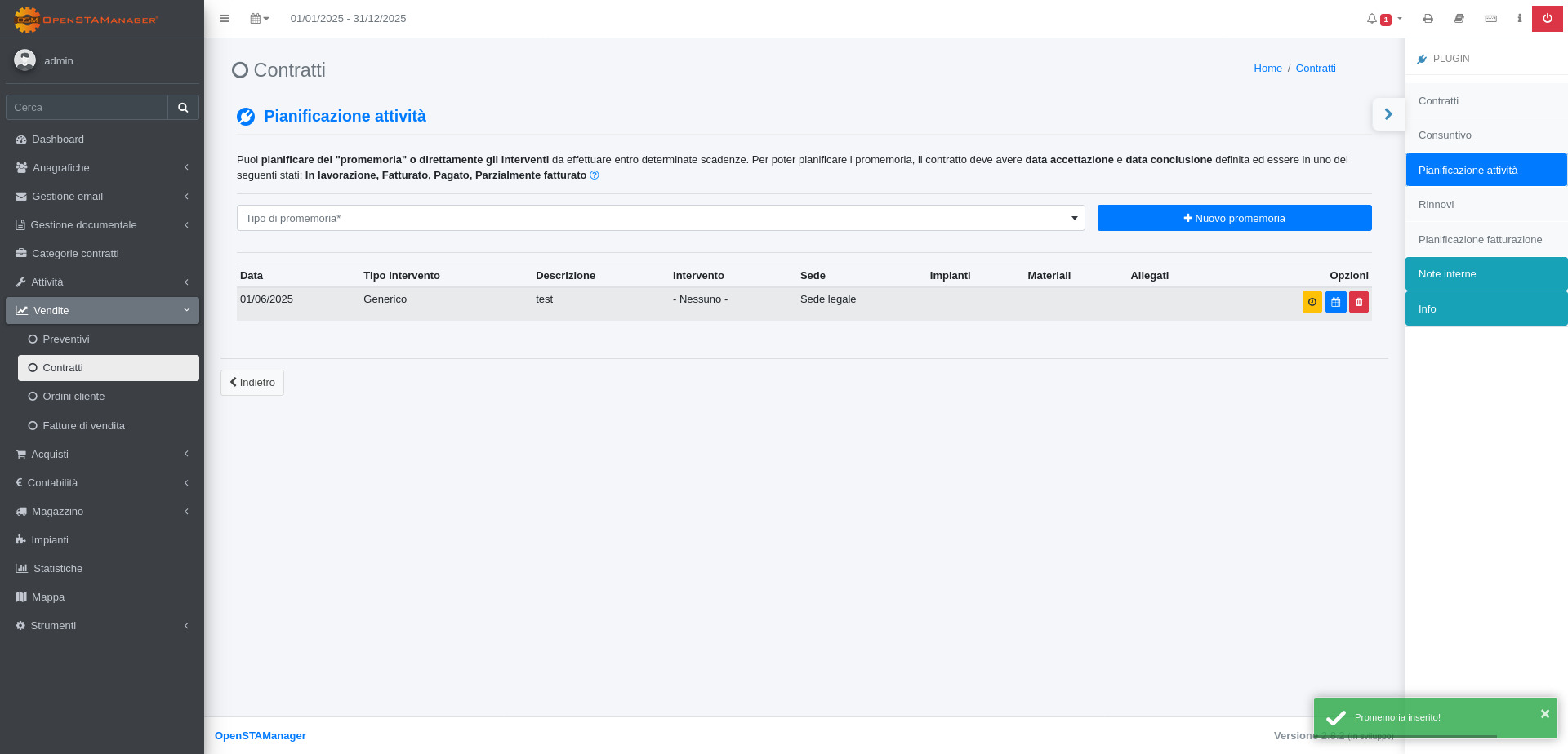 Il plugin Pianificazione attività è una componente del modulo Contratti dedicata alla completa gestione della pianificazione delle attività (promemoria) relative ai contratti registrati all'interno di OpenSTAManager.