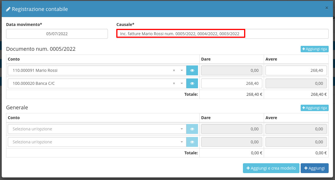 Si presenterà la seguente schermata dove cliccare su Aggiungi per confermare le scritture da registrare.