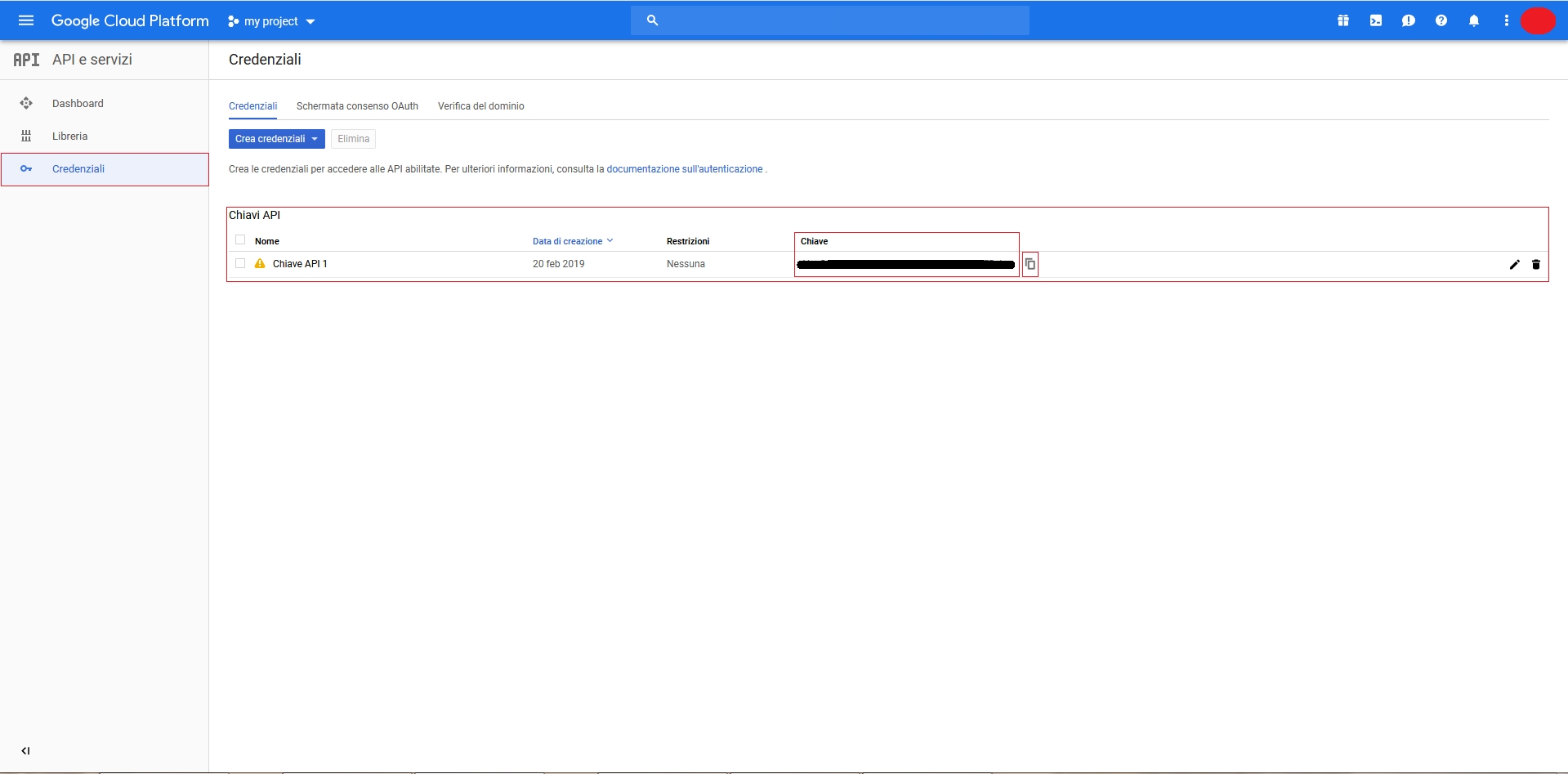 Dalla schermata che si presenta ora, si dovrà cliccare su Crea credenziali e selezionare Chiave API. Ora la chiave API è stata creata.