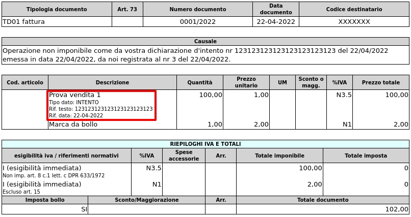 Andando ora a creare una Fattura di vendita per quello specifico cliente, si riscontreranno i dati relativi alla Dichiarazione d'intento registrata e la disponibilità residua.