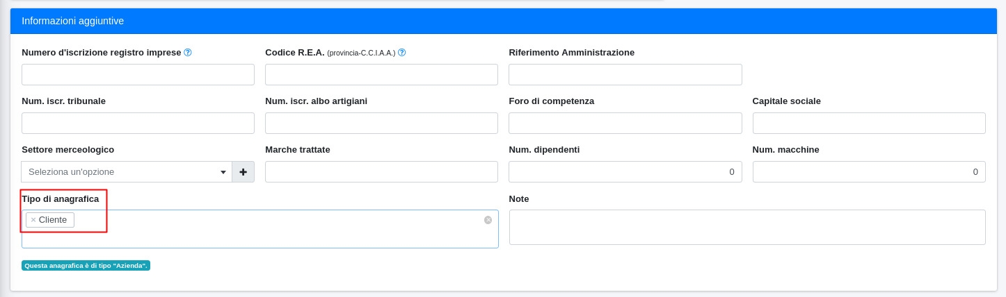 ● Impostare il tipo di anagrafica Cliente, oltre ad Azienda, per l'anagrafica azienda: