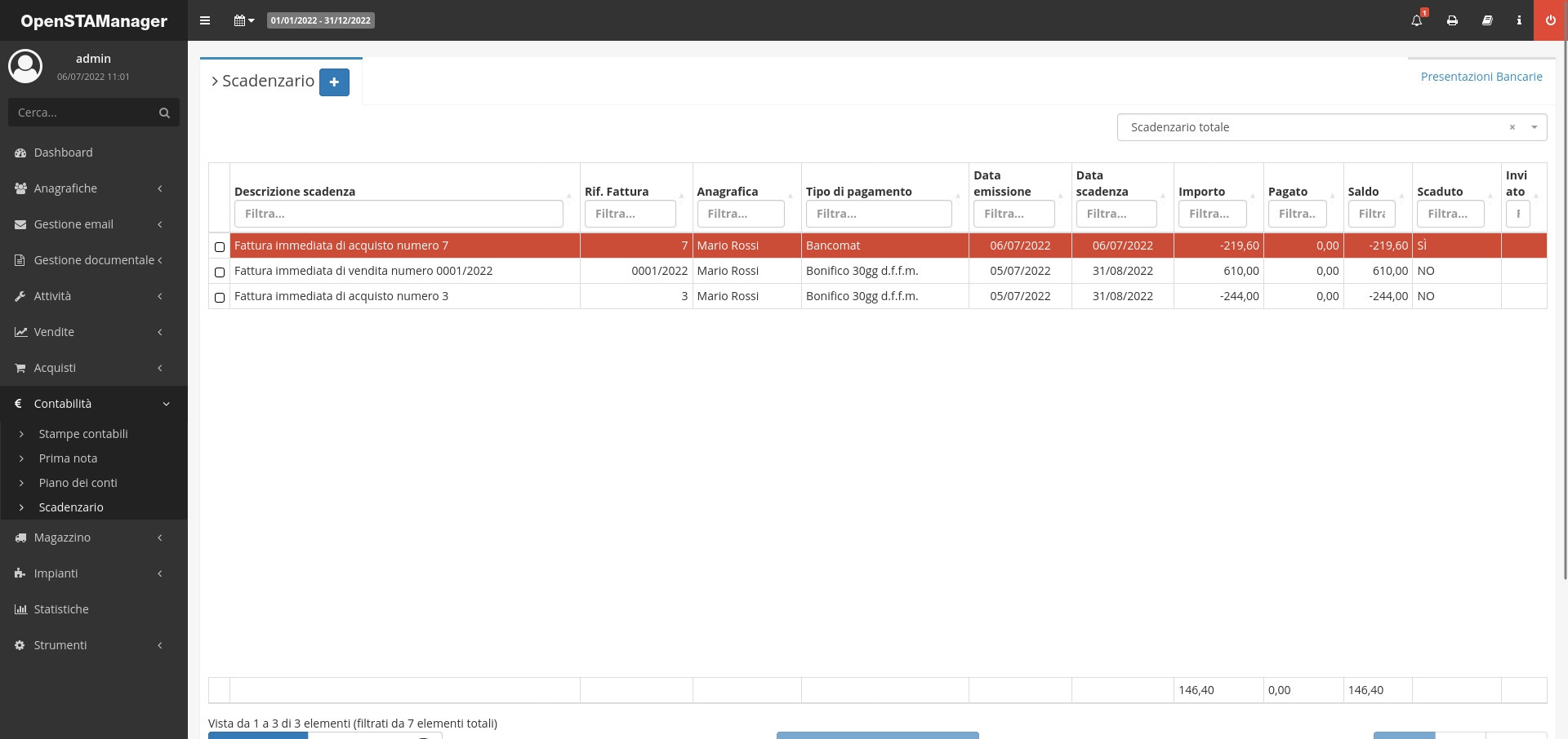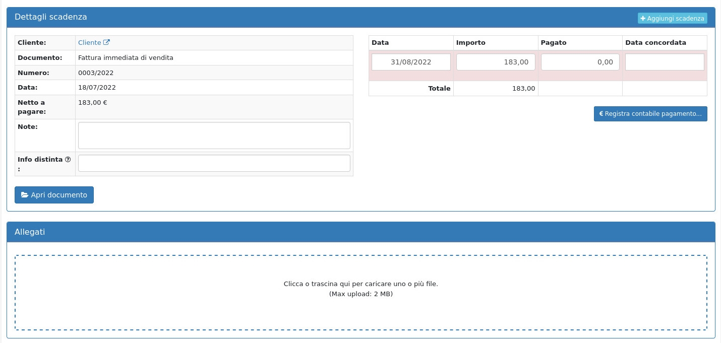 Una nuova scadenza verrà generata automaticamente all'emissione di una fattura di vendita e di acquisto, o può essere creata manualmente cliccando sul tasto (+).