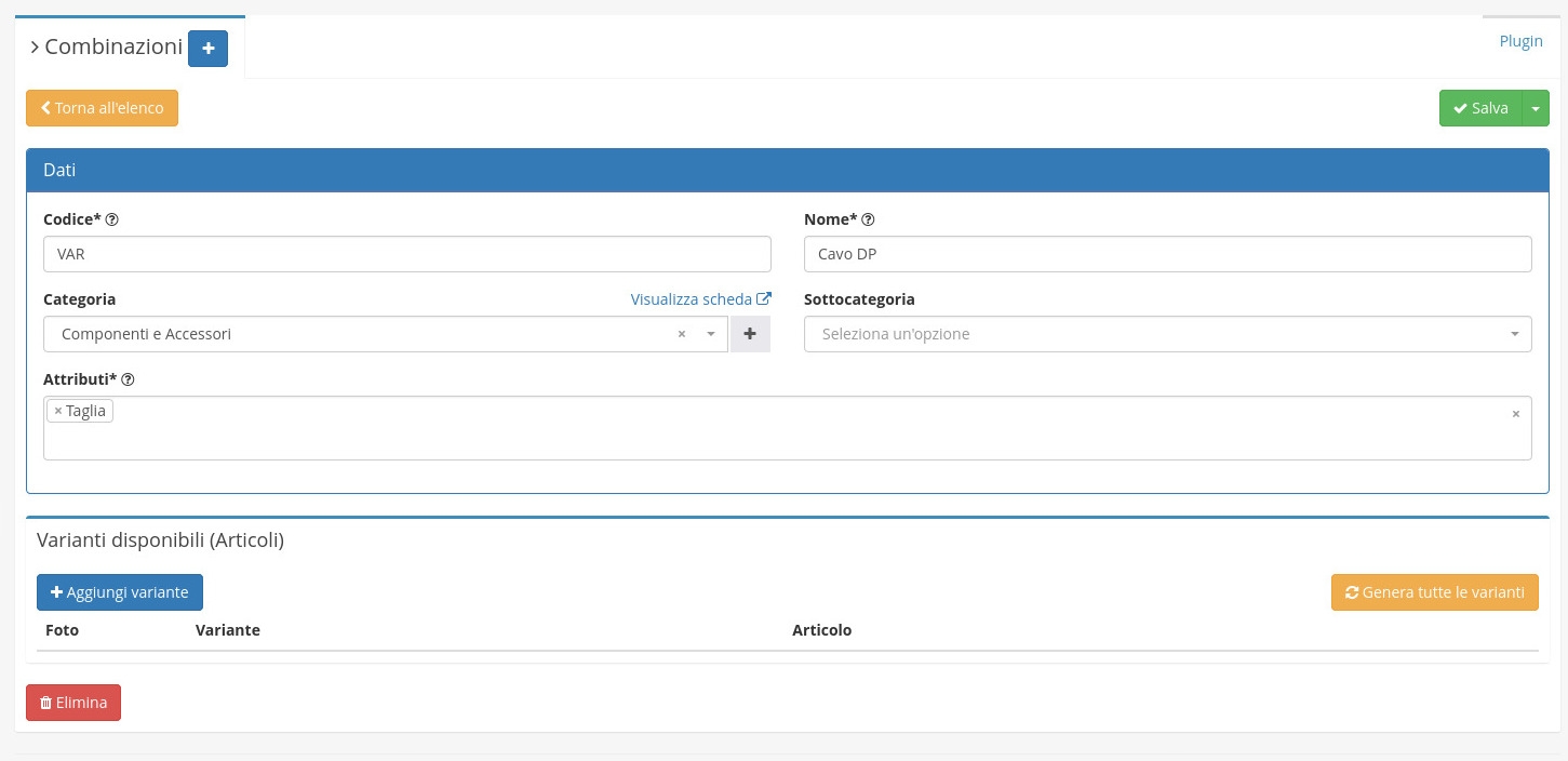 Cliccando su Aggiungi variante invece, sarà possibile associare a ogni valore un articolo esistente dal magazzino.