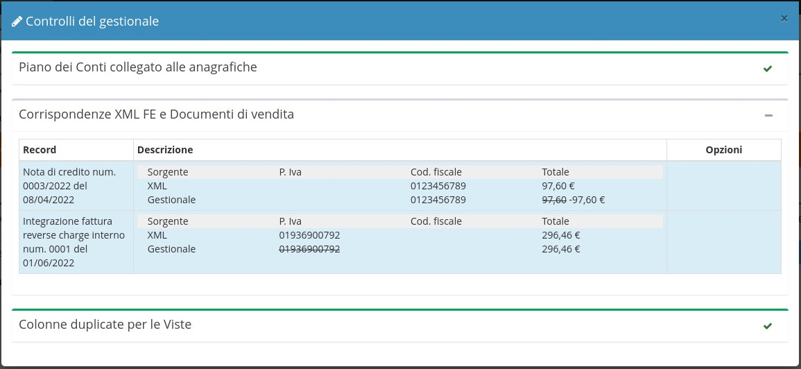 Controlla gestionale: Verifica le voci del piano dei conti collegate alle anagrafiche, la corrispondenza tra XML FE e Documenti di vendita, e le colonne duplicate per le viste.