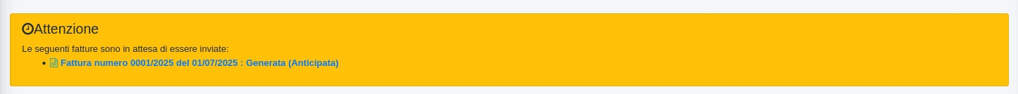 Nel caso siano presenti delle fatture di vendita generate ma non ancora inviate (entro i 12 giorni dalla scadenza per inviare le fatture allo SDI), verranno segnalate dal gestionale con un avviso nella sezione fatture di vendita.