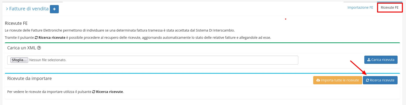 Si dovrà quindi dal modulo Vendite/Fatture di vendita cliccare sul plugin Ricevute FE/Ricerca ricevute e in seguito procedere a importarle facendo clic sul tasto Importa tutte le ricevute.