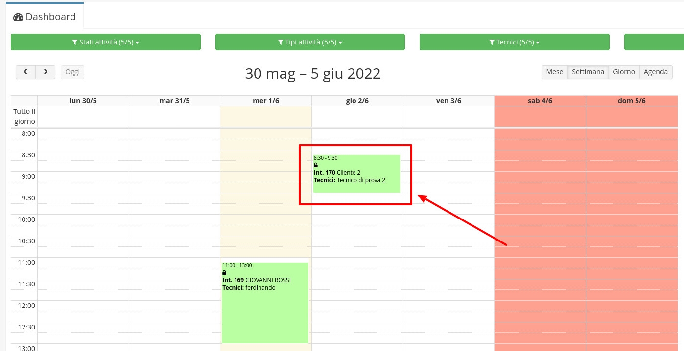 Andando ora ad aprire il calendario si potranno vedere gli interventi registrati sulla dashboard.