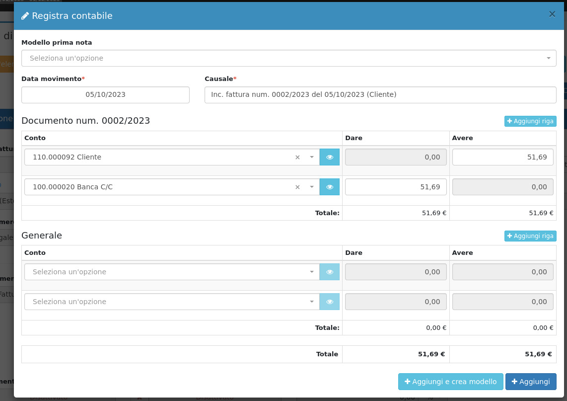 Si aprirà quindi il modal precompilato da cui registrare il movimento in prima nota relativo al pagamento, cliccando su Aggiungi.