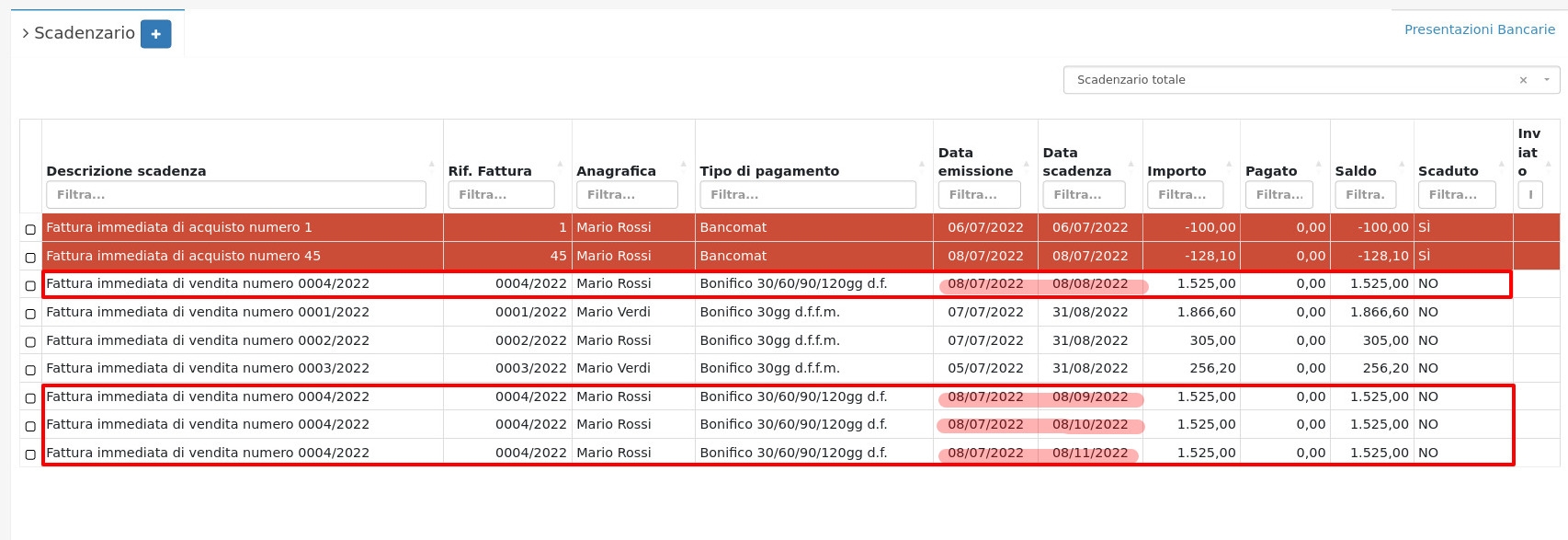 Nello Scadenzario sono presenti sia le Fatture di acquisto che le Fatture di vendita. Le fatture con importo positivo sono Fatture di vendita, le fatture con importo negativo sono Fatture di acquisto.