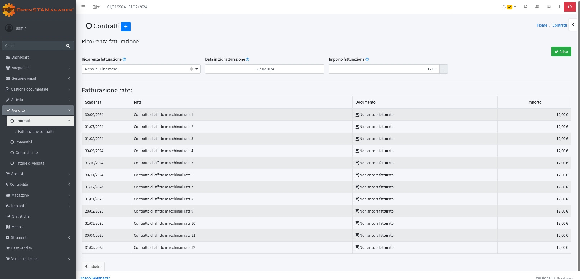 Da qui sarà possibile definire la ricorrenza di fatturazione, la data di inizio e l'importo che dovrà avere ogni rata. Al salvataggio delle impostazioni verrà visualizzata una tabella con tutte le scadenze generate: