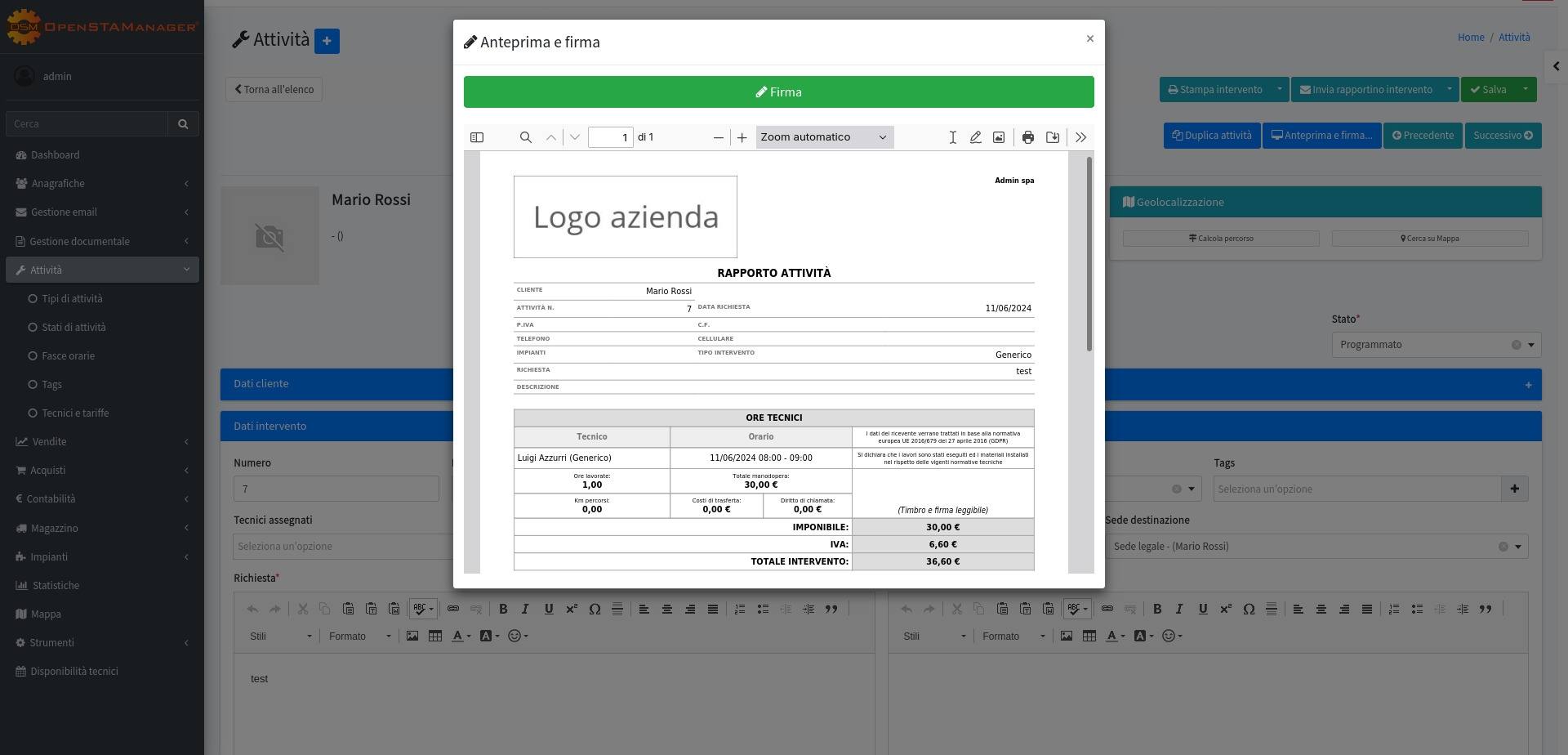 Cliccando su un intervento nel calendario è possibile accedere alla sua schermata di dettaglio, da dove è possibile apportare modifiche, stamparne le specifiche, inviare il rapportino e la notifica di presa in carico, e accedere al pannello di anteprima e firma.