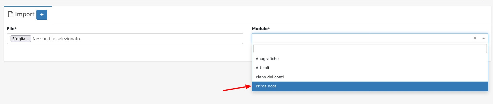 Si dovrà andare in Strumenti/Import e cliccare sul tasto (+). Da qui si dovrà quindi selezionare Prima nota nel menu a tendina.