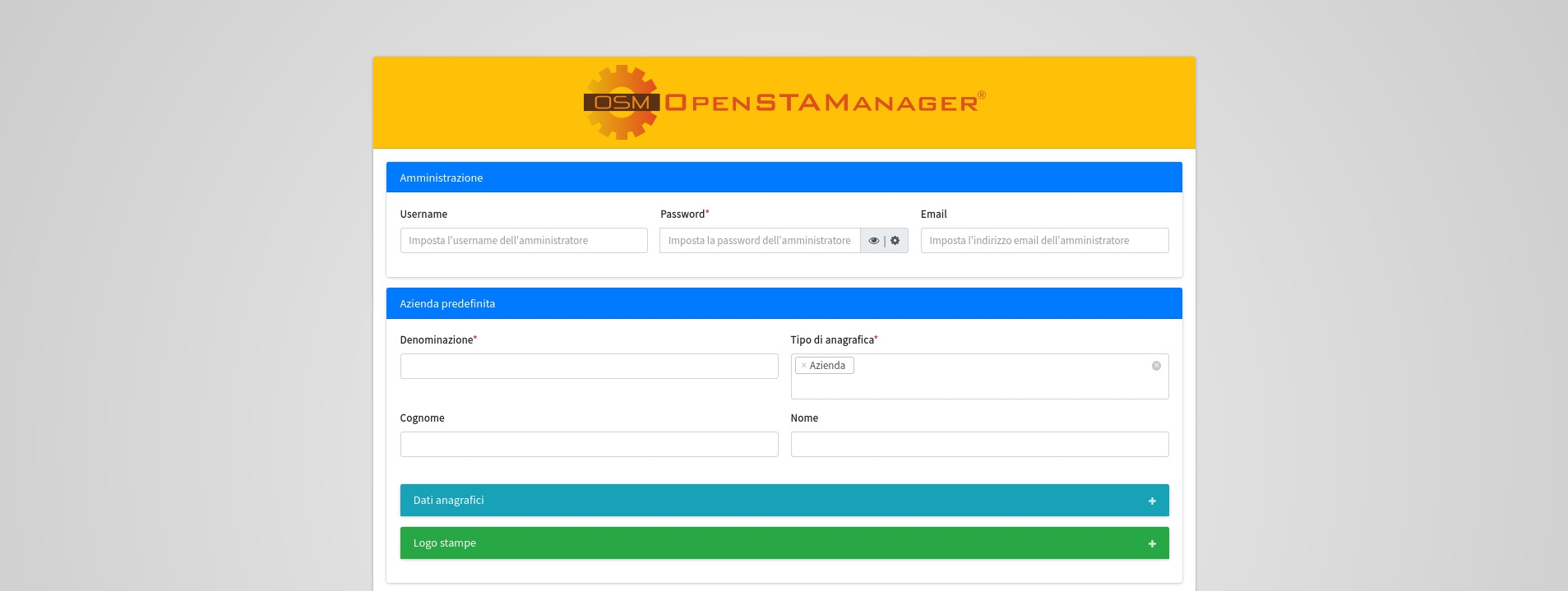 Andranno qui immesse le informazioni base dell'azienda per effettuare il primo accesso, suddivise in: