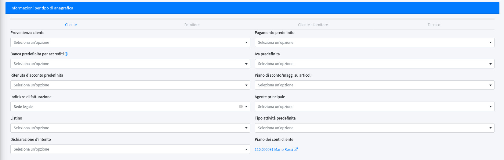 In questa sezione si possono impostare dei valori predefiniti in base al tipo di anagrafica: