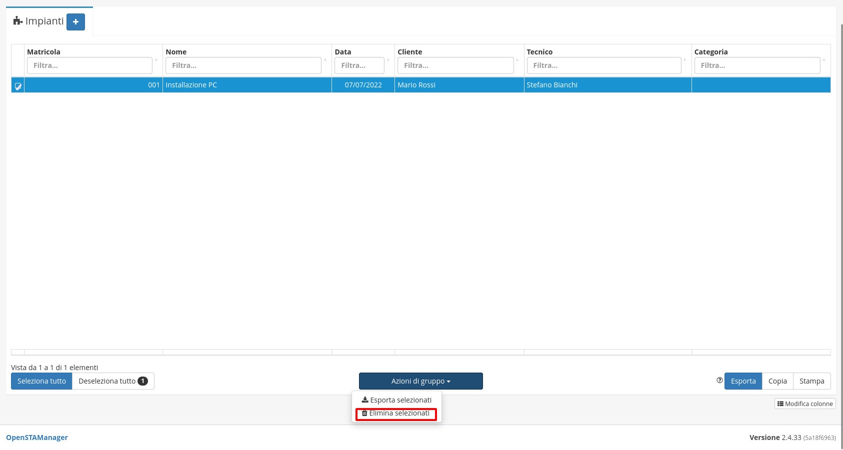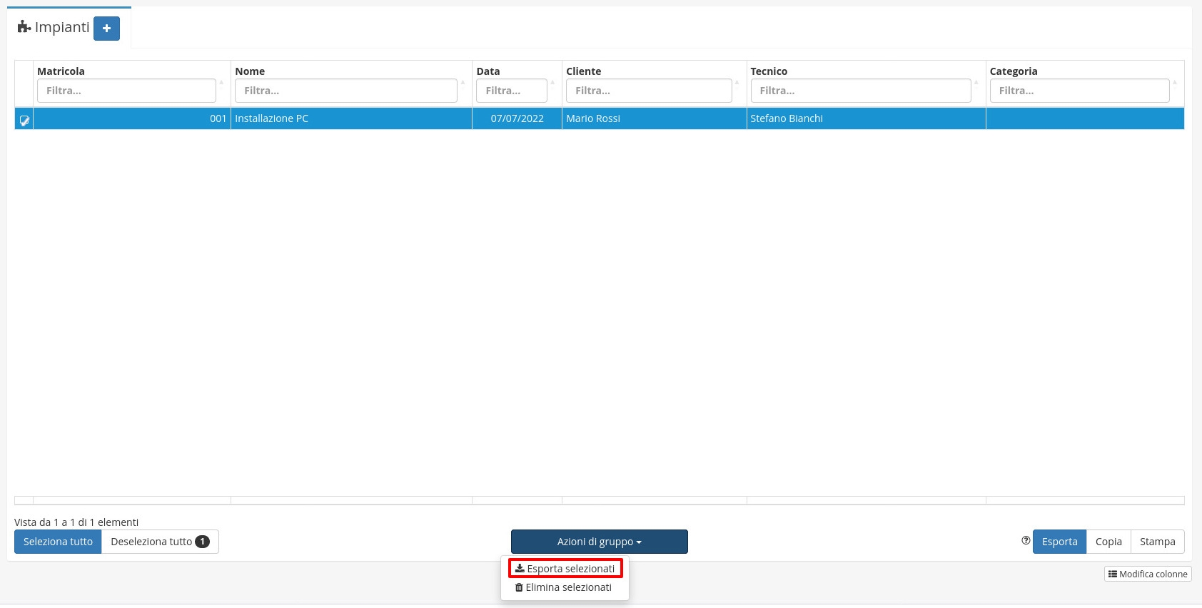 Il modulo Impianti permette l'Esportazione e l'Eliminazione massiva tramite le Azioni di gruppo.