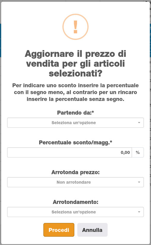 Il gestionale chiederà ora il coefficiente di vendita da applicare agli articoli, fare clic su Procedi per confermare.
