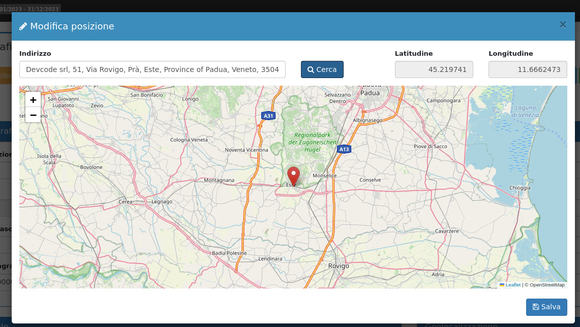 Da qui si dovrà inserire l'indirizzo, così le due coordinate potranno venir correttamente calcolate cliccando su Cerca. Una volta terminato si dovrà cliccare su Salva.