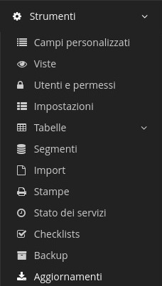 💡Campi personalizzatichevron-right👀Vistechevron-right🗣️Utenti e permessichevron-right🎚️Impostazionichevron-right🗃️Tabellechevron-right🪢Segmentichevron-right📥Importchevron-right🖨️Stampechevron-right🚦Stato dei servizichevron-right☑️Checklistschevron-rightBackupchevron-right🔝Aggiornamentichevron-right