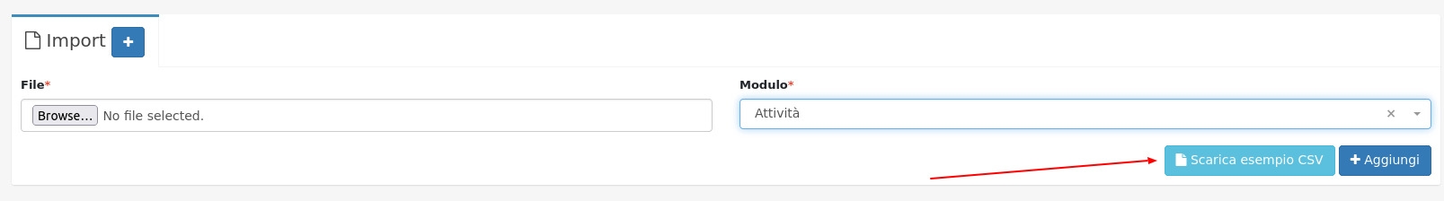 Accedere dal menù di OpenSTAManager al modulo Strumenti/Import e impostare Attività nel menù a tendina, dopo aver selezionato il modulo sarà visibile un nuovo pulsante nella schermata "Scarica esempio CSV".